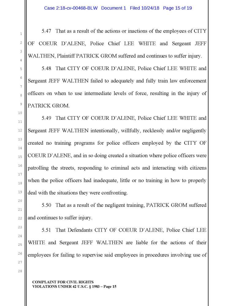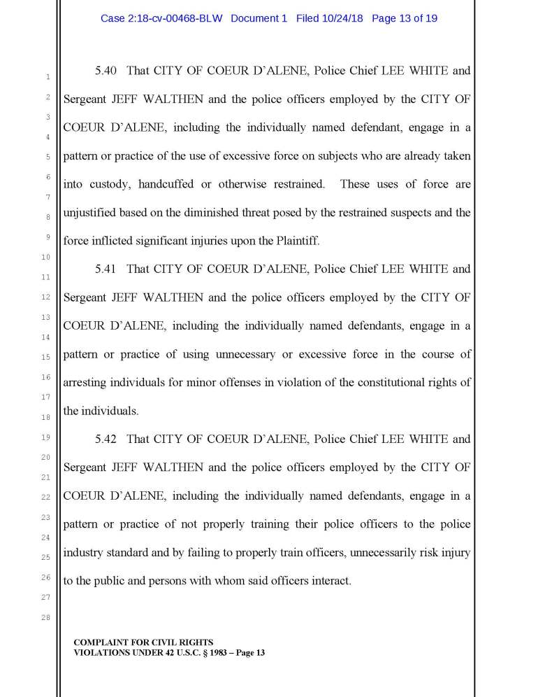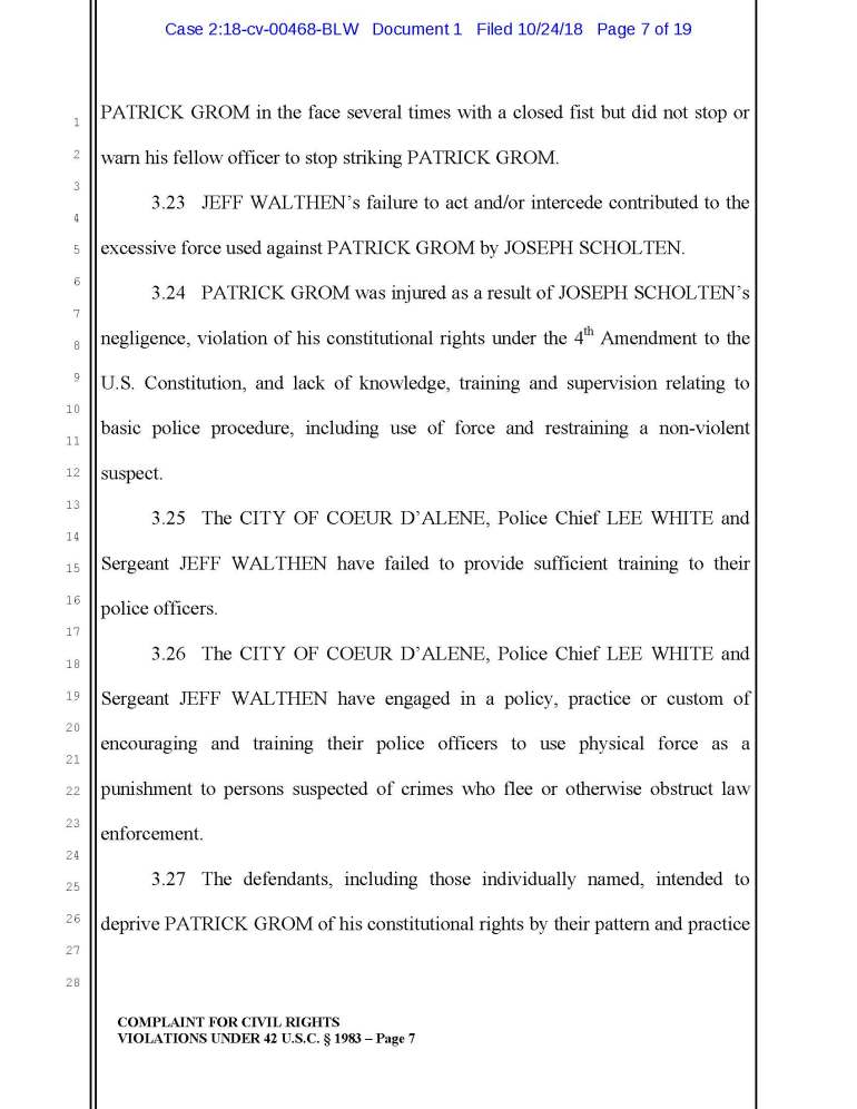 3.26 The CITY OF COEUR D’ALENE, Police Chief LEE WHITE and Sergeant JEFF WALTHEN have engaged in a policy, practice or custom of encouraging and training their police officers to use physical force as a punishment to persons suspected of crimes who flee or otherwise obstruct law enforcement.