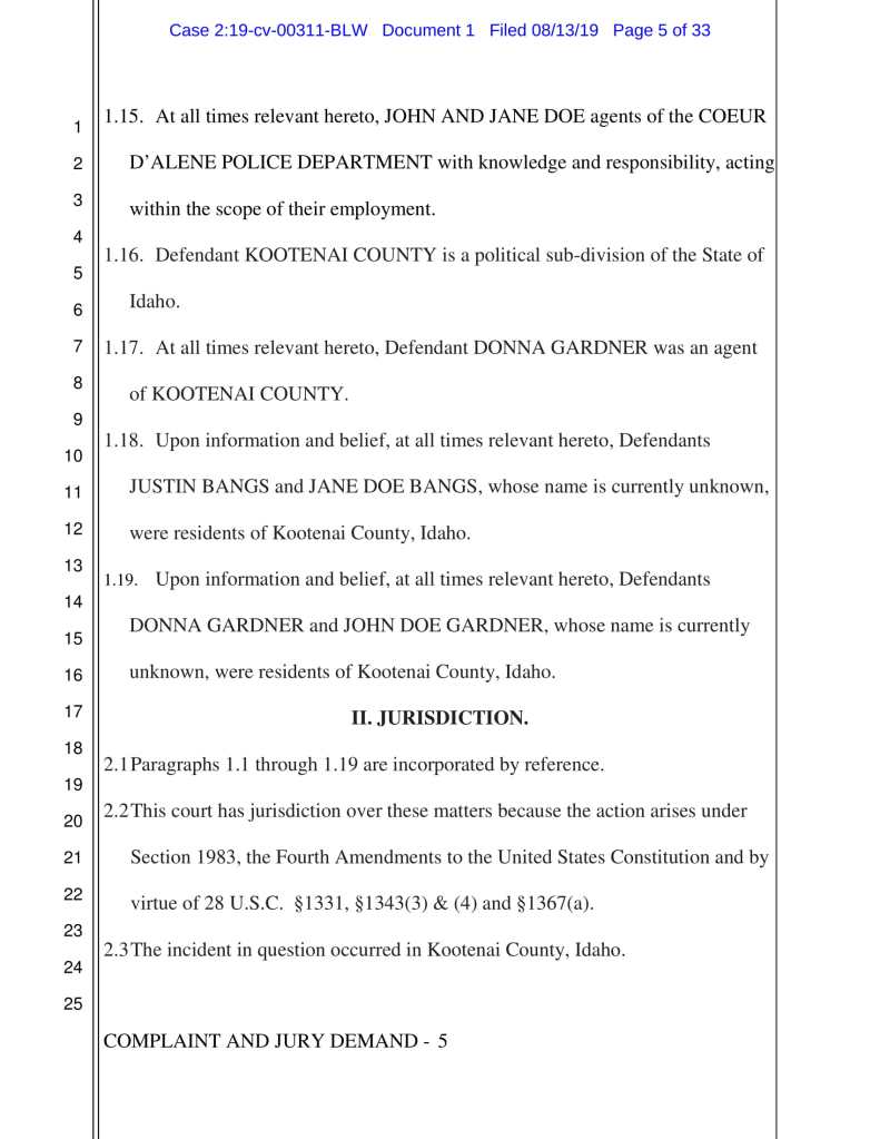 JOHN AND JANE DOE, as agents with knowledge and responsibility of the COEUR D’ ALENE POLICE DEPARTMENT;